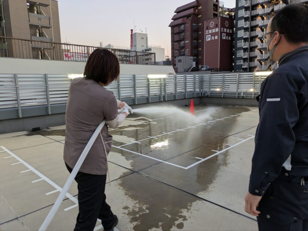 先日、分院が入居する EH第3ビルにて消防訓練が実施され、当院スタッフも参加して、消火器・消火用散水栓の使用方法の説明と実践、そして避難経路の確認を行いました。