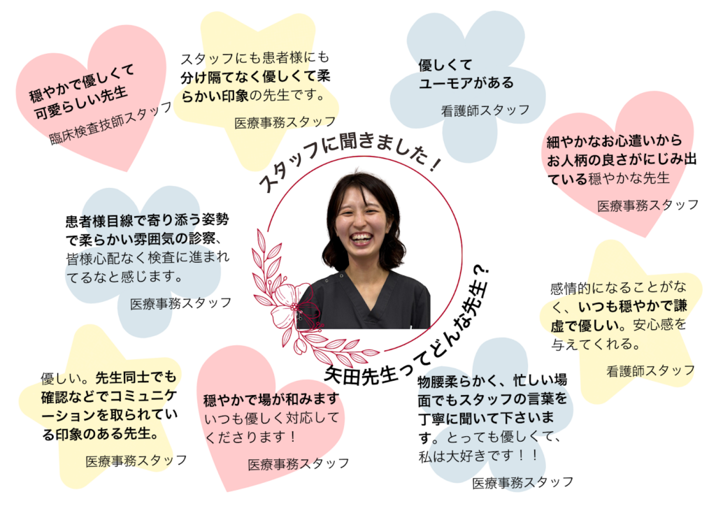 2025年1月に常勤医師として入職し、2025年10月の分院開院後は本院・分院の両院で活躍されている矢田先生。